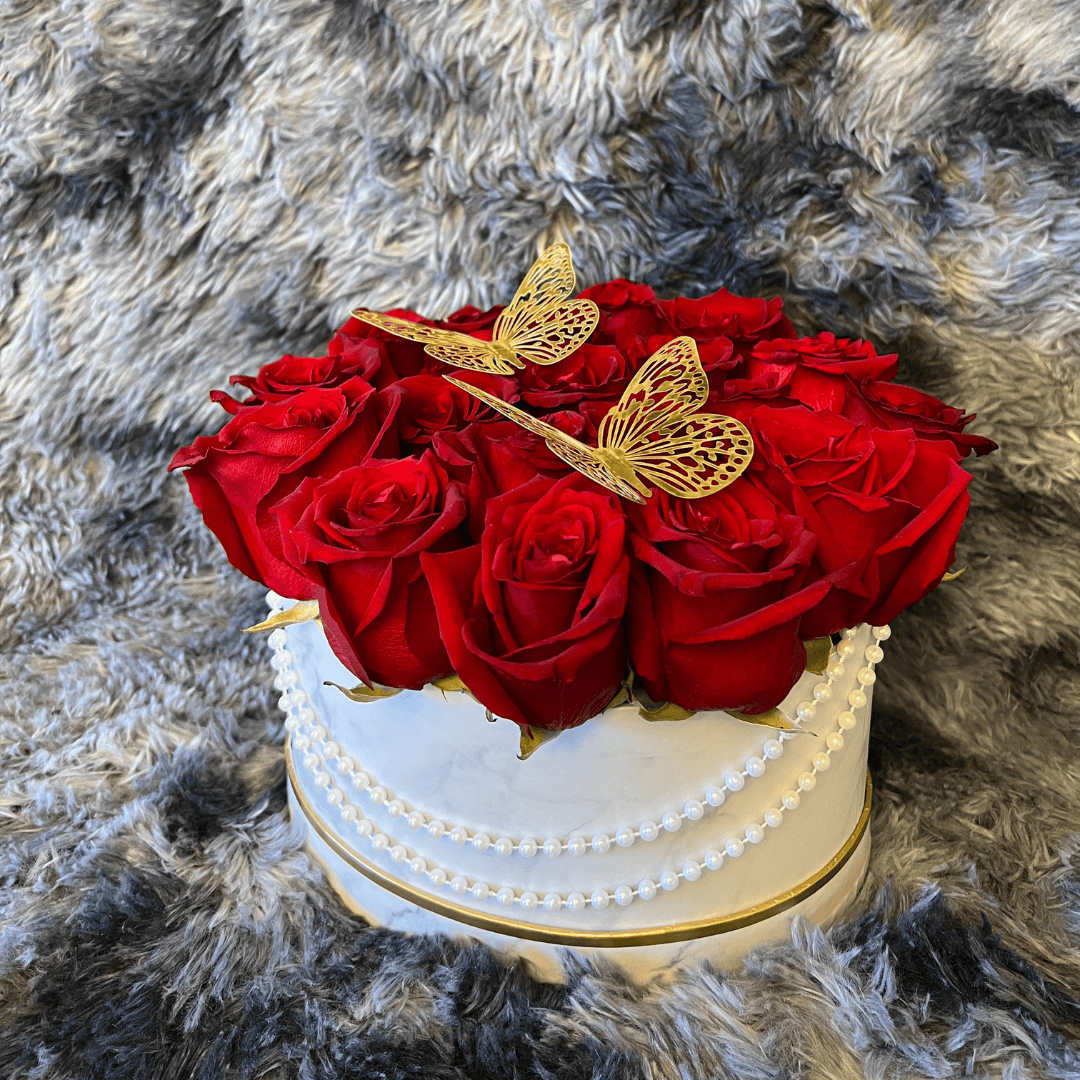 My Heart is a romantic masterpiece that beautifully captures the essence of love and devotion. A stunning bouquet of deep red roses symbolizes passion and commitment, while delicate butterflies flutter among the petals, representing the freedom and grace of love. Adding an extra touch of elegance, the arrangement is adorned with shimmering pearls, making this gift a true reflection of timeless romance.